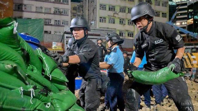 The 1,000lb 1.5 metre explosive was discovered 'intact' by construction workers in Quarry Bay, a business district on the west side of Hong Kong Island.